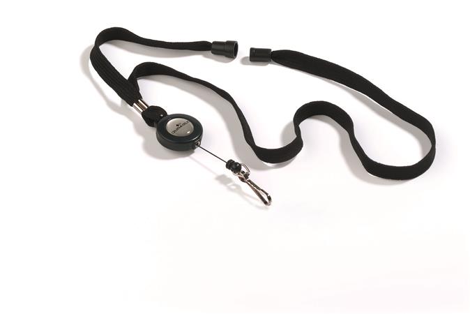 Azonosítókártya-tartó, kihúzható, karabineres, fekete nyakba akasztóval, DURABLE