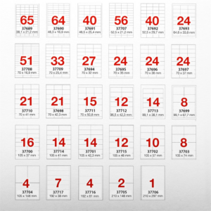 a-series etikett címkék A4-es lapokon. Méretek: 70×50,8 mm, szín: fehér, anyaga: címkepapír (60 g / m2), ragasztó: öntapadó (tartós ragasztó), címkék csomagonként: 1500 darab, lapok csomagonként: 100 lap. Nyomtatható: minden lézer- és tintasugaras nyomtatóval, fénymásolóval, színes lézernyomtatókkal és színes fénymásolókkal. Kivitel: préselt, körbefutó biztonsági él, fehér klímavédő csomagolás. Katalóguskód: 37711