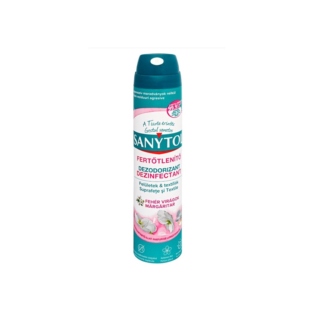 A Sanytol, a klórmentes fertőtlenítés szakértője kifejlesztette fertőtlenítő légfrissítő aeroszolját, mely biztosítja Önnek a tökéletes higiéniát és kellemes illatot varázsol környezetébe. Egyedülálló összetételének köszönhetően semlegesíti a kellemetlen szagokat és elpusztítja a felületeken és textíliákon megtelepedett kórokozók 99,9%-át. Fertőtlenít és tisztít. Semlegesíti és eltünteti a szagokat. Nem károsítja a felületeket.