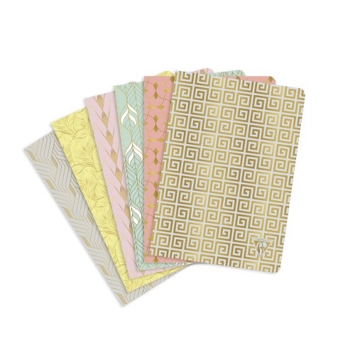 - Geometrikus és organikus minták egy kis arannyal fűszerezve, mely egyedi és elegáns megjelenést kölcsönöz a füzetnek.