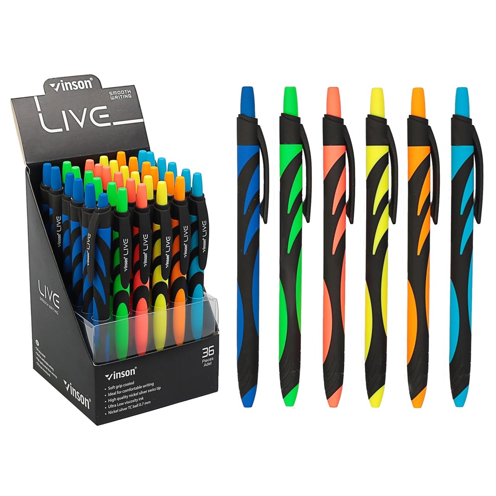 Vinson F20 Live nyomógombos, csúszásmentes gumírozott testű golyóstoll. A betét kék színű olajzselés tintát tartalmaz, mely könnyű gördülékeny írást tesz lehetővé. Nem cserélhető betétes. Vegyes neon színű külső testtel. Kiszerélés: 36 db/display.