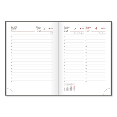 - terjedelem: 352 oldal (16 információs oldal, 320 naptároldal, jegyzetek, telefonregiszter)