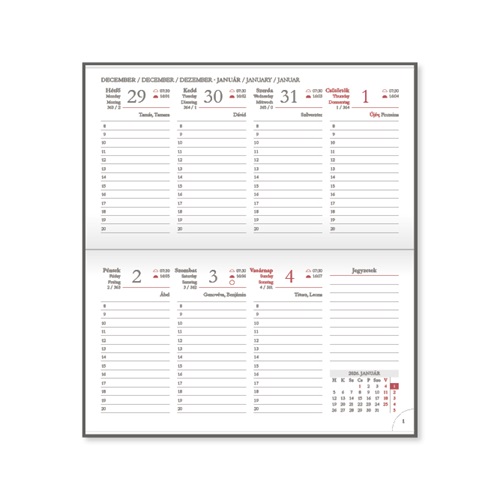 - Terjedelem: 140 oldal (16 információs oldal, 112 naptároldal, 2027 januári tervező, jegyzetek, telefonregiszter)
