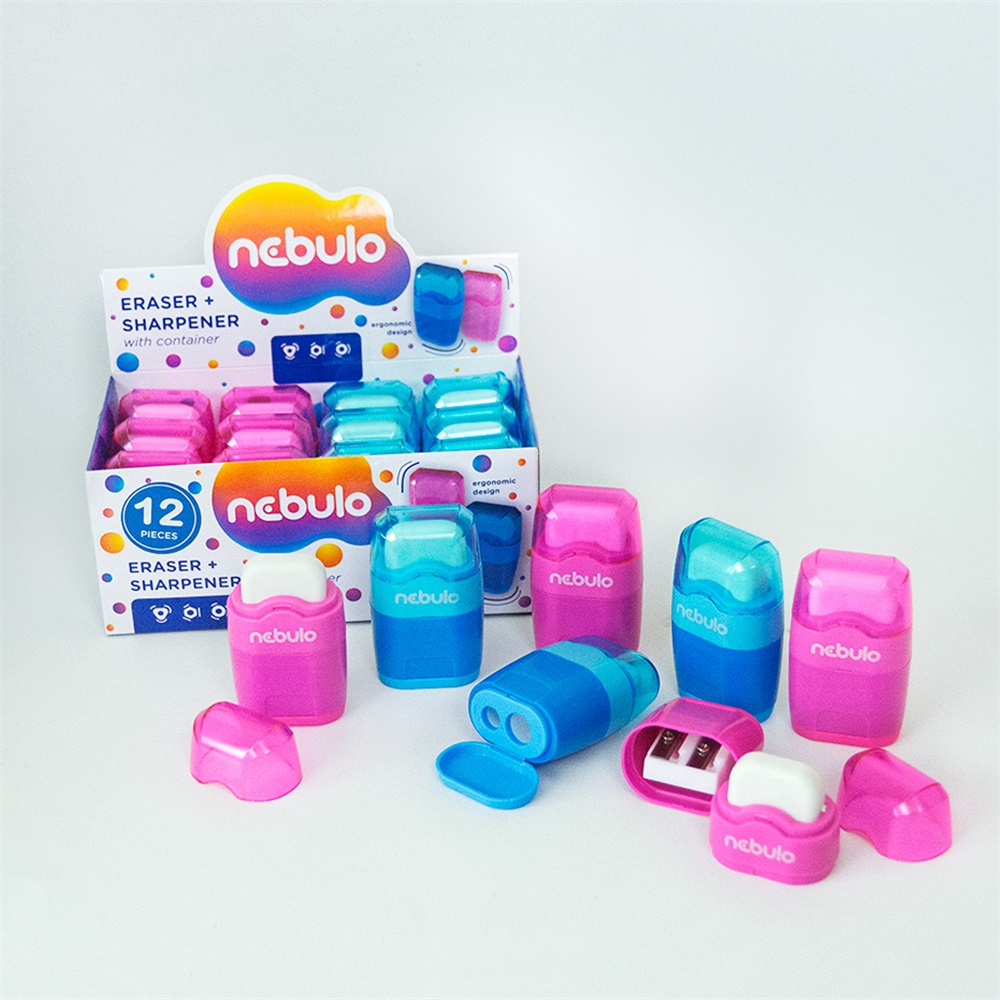 | Név | Hegyező 2 lyukú műanyag, tartályos+radír egyben 12 db/doboz, Nebulo vegyes színek |