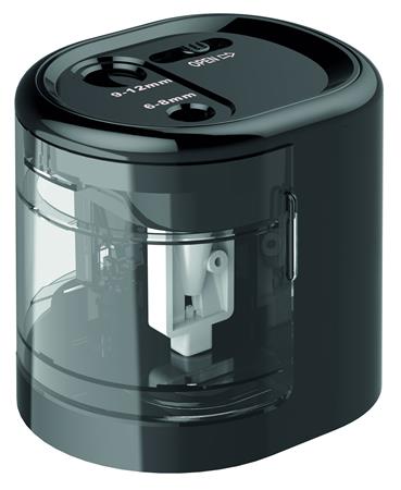 Hegyező, kétlyukú, asztali, elemes, USB töltővel, RAPESCO”PS12-USB”, fekete