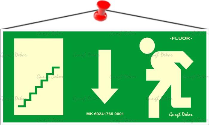 | Név | Információs tábla, 25×11,5 cm, fluoreszkáló, utánvilágítós, "Menekülési irány le, lépcső balra" |