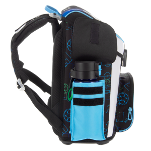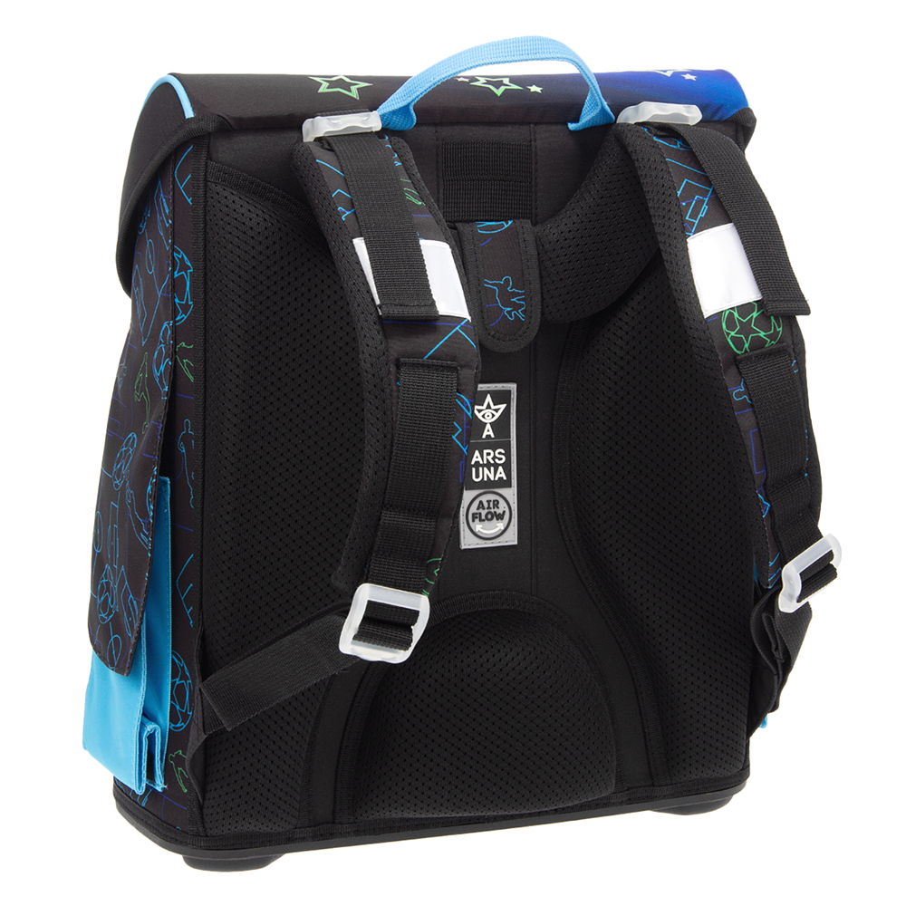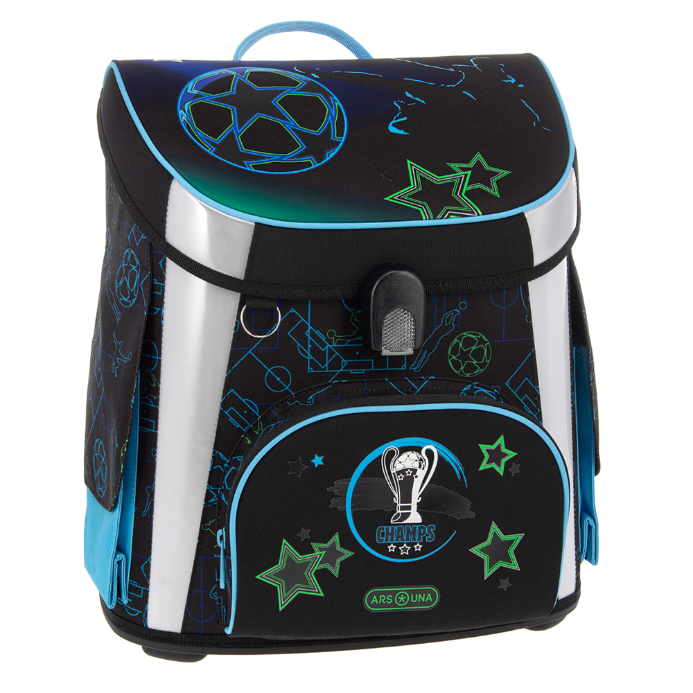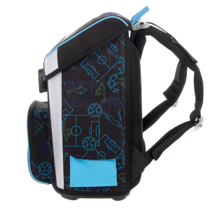 Hátizsák formájú iskolatáska. Könnyű súlyú, formatartó szerkezetű, vízlepergető anyagból. Gerinckímélő, vastagon párnázott, merevített, ergonómikus hátkiképzéssel. Puha, méretre állítható vállpántokkal és plusz állítható pántokkal, amelyekekkel szabályozható, hogy mennyire álljon feszesen a gyerek hátához simulva a táska. Alja tartós kemény műanyag. Nagy felületű fényvisszaverő elemekkel elől, oldalt és a vállpántokon. Felülről könnyen pakolható, teteje FIDLOCK mágneszárral záródik. Belsejében egy textil elválasztó elemmel, két nagy rekesszel. A táska tetején belül átlátszó műanyag órarendtartóval és órarenddel. Oldalán két zsebbel a kulacs részére, elején egy cipzáros zseb az uzsonnás doboz részére. Tetején műanyag fogantyúval. Mérete: 330x410x255 mm. Súlya: 1.2 kg. Táska űrtartalma: 18 l. Terhelhetőség: 12 kg. 3 év garancia.