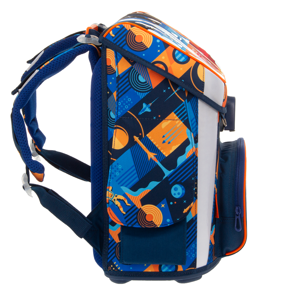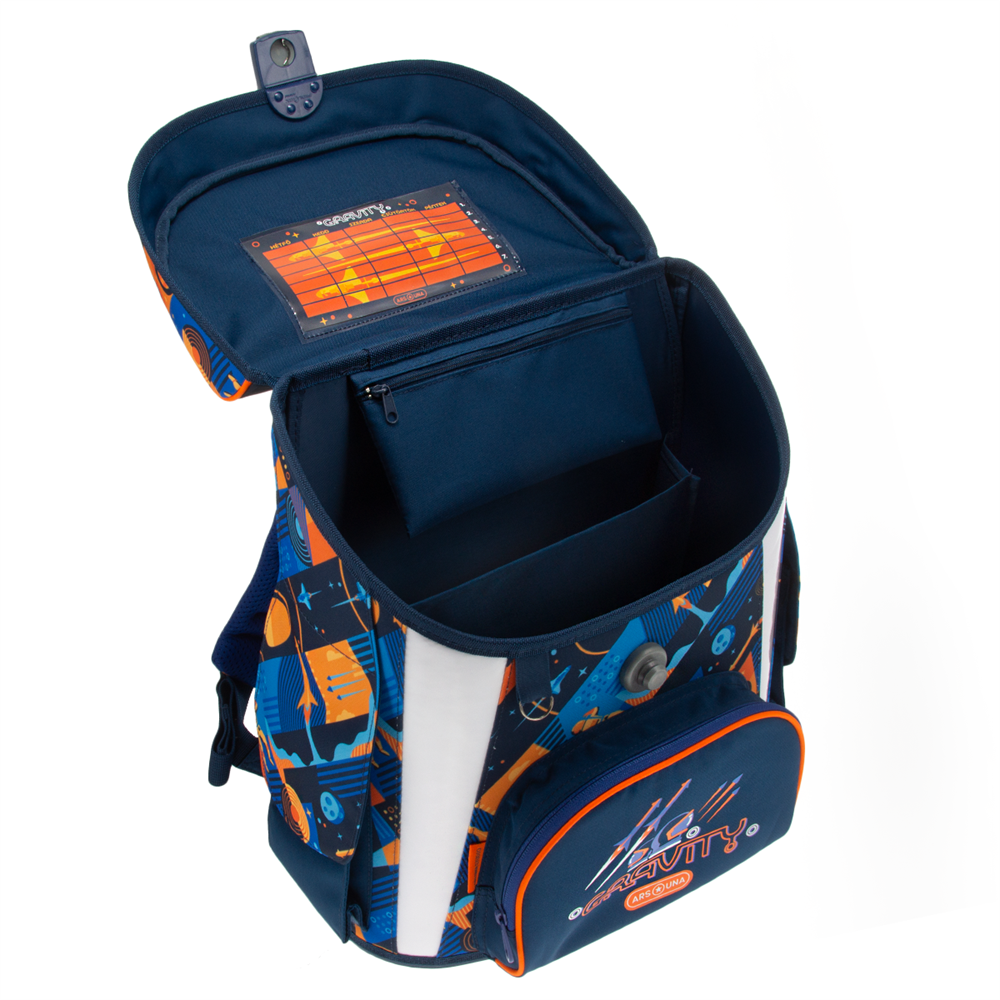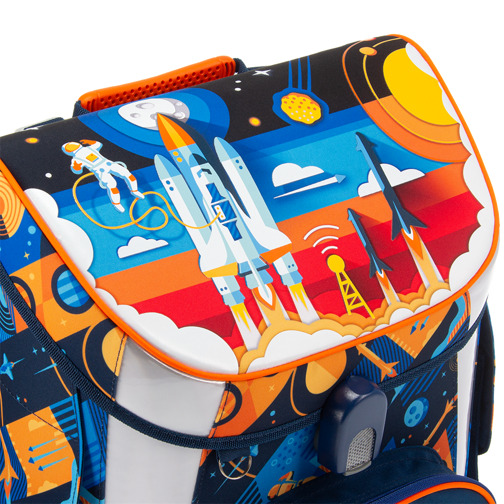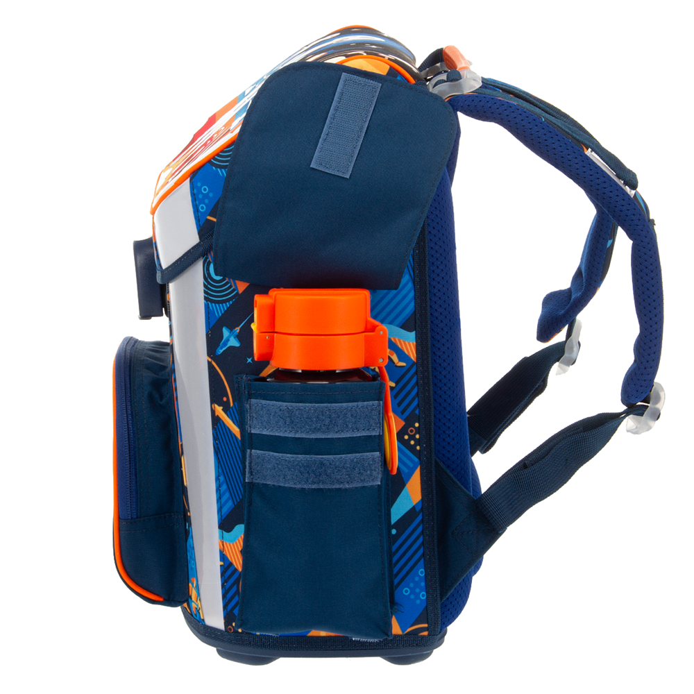 Hátizsák formájú iskolatáska. Könnyű súlyú, formatartó szerkezetű, vízlepergető anyagból. Gerinckímélő, vastagon párnázott, merevített, ergonómikus hátkiképzéssel. Puha, méretre állítható vállpántokkal és plusz állítható pántokkal, amelyekekkel szabályozható, hogy mennyire álljon feszesen a gyerek hátához simulva a táska. Alja tartós kemény műanyag. Nagy felületű fényvisszaverő elemekkel elől, oldalt és a vállpántokon. Felülről könnyen pakolható, teteje FIDLOCK mágneszárral záródik. Belsejében egy textil elválasztó elemmel, két nagy rekesszel. A táska tetején belül átlátszó műanyag órarendtartóval és órarenddel. Oldalán két zsebbel a kulacs részére, elején egy cipzáros zseb az uzsonnás doboz részére. Tetején műanyag fogantyúval. Mérete: 330x410x255 mm. Súlya: 1.2 kg. Táska űrtartalma: 18 l. Terhelhetőség: 12 kg. 3 év garancia.