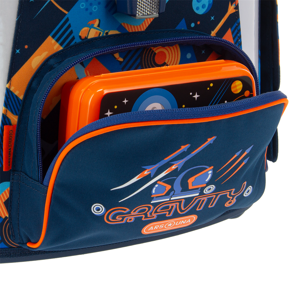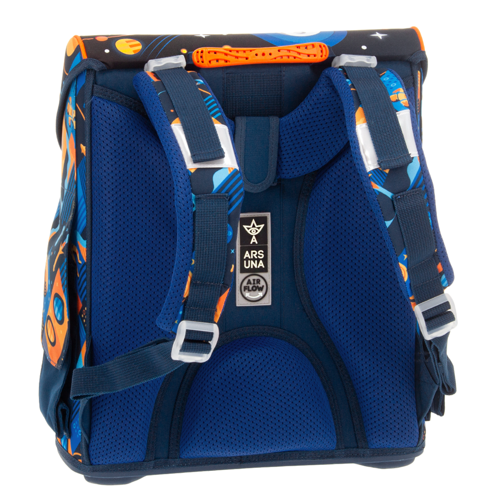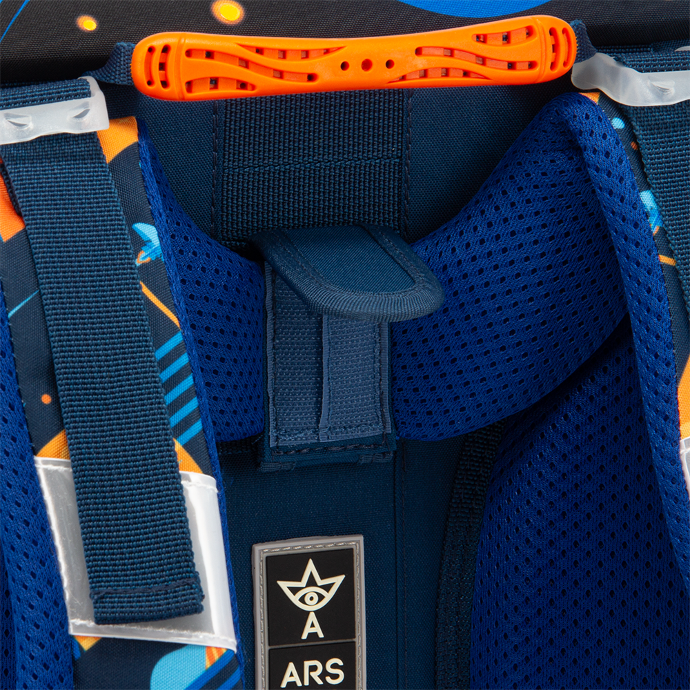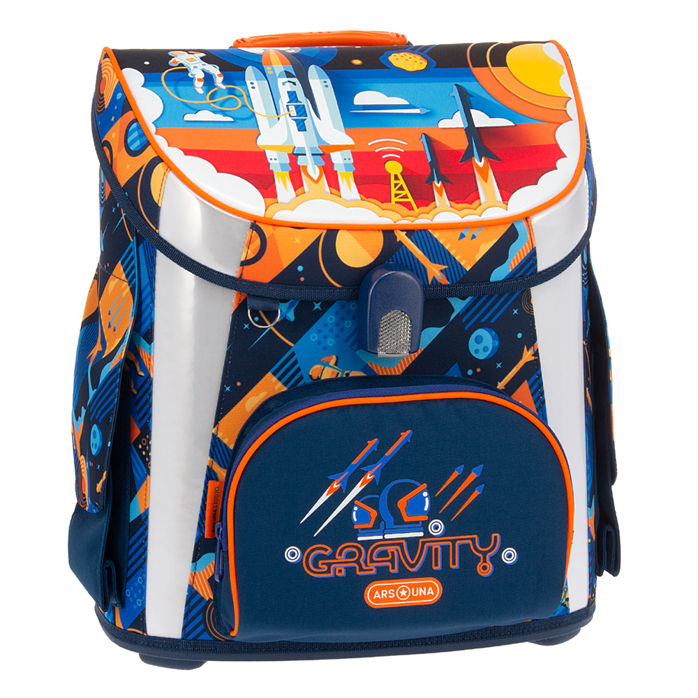 Hátizsák formájú iskolatáska. Könnyű súlyú, formatartó szerkezetű, vízlepergető anyagból. Gerinckímélő, vastagon párnázott, merevített, ergonómikus hátkiképzéssel. Puha, méretre állítható vállpántokkal és plusz állítható pántokkal, amelyekekkel szabályozható, hogy mennyire álljon feszesen a gyerek hátához simulva a táska. Alja tartós kemény műanyag. Nagy felületű fényvisszaverő elemekkel elől, oldalt és a vállpántokon. Felülről könnyen pakolható, teteje FIDLOCK mágneszárral záródik. Belsejében egy textil elválasztó elemmel, két nagy rekesszel. A táska tetején belül átlátszó műanyag órarendtartóval és órarenddel. Oldalán két zsebbel a kulacs részére, elején egy cipzáros zseb az uzsonnás doboz részére. Tetején műanyag fogantyúval. Mérete: 330x410x255 mm. Súlya: 1.2 kg. Táska űrtartalma: 18 l. Terhelhetőség: 12 kg. 3 év garancia.