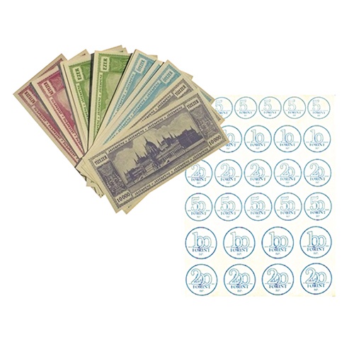 - a csomag tartalma: 20.000 1 db, 10.000 2 db, 5000 4 db, 2000 5 db, 1000 5 db, 500 2 db, 2 lap aprópénz