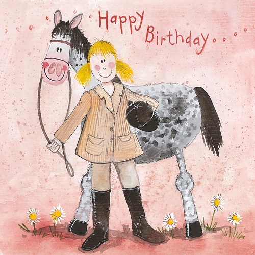 Képeslap Alex Clark borítékkal, 14×14 cm, Lány lóval HBD