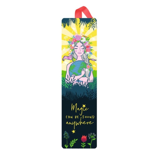 Ez az elegáns és divatos könyvjelző tökéletes kiegészítője lehet bármely könyvnek. A könyvjelző színes, természet ihlette dizájnnal rendelkezik, amely egy női arcot ábrázol virágok és levelek között, amint a Földet öleli. A sötét háttér kiemeli a dizájn élénk színeit. Az alján a “Magic can be found anywhere” felirat olvasható, ami arra ösztönzi az olvasót, hogy bárhol megtalálja a varázslatot. Az elasztikus szalag biztosítja, hogy a könyv szorosan zárva maradjon.