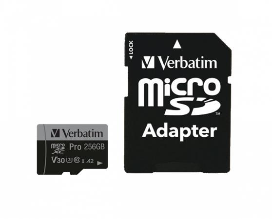 Memóriakártya, microSDXC, 256GB, CL10/U3/A2, 100/90 MB/s, adapter, VERBATIM “PRO”
