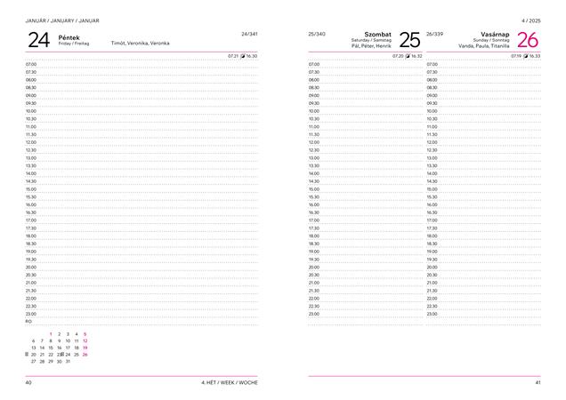 A Victoria Office "Chrono" napi beosztású tervezője nélkülözhetetlen társ az üzleti- és a magánéletben. Klasszikus megjelenése és színválasztéka észrevétlenül illeszkedik minden környezetbe. Praktikus kialakításának köszönhetően tökéletes választás a feljegyzések vezetésére, tervezésre.