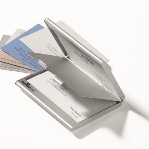 Elegáns, alumínium névjegykártyatartó, matt ezüst felülettel.