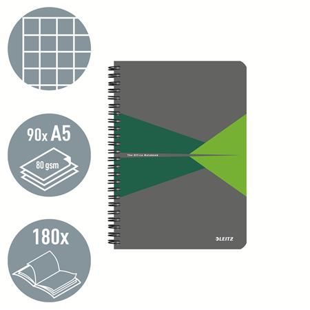Spirálfüzet, A5, kockás, 90 lap, PP borító, LEITZ “Office”, szürke-zöld