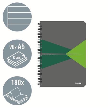 | Név | Spirálfüzet, A5, vonalas, 90 lap, laminált karton borító, LEITZ "Office", szürke-zöld |