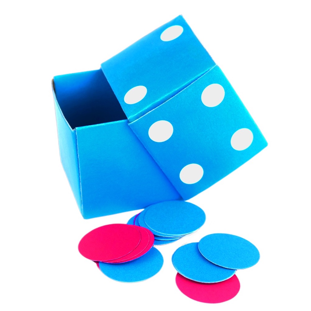 Mázolt kartonból készült ofszet technológiával nyomott doboz tető és alsó. 50×40 mm, A doboz tartalma 30 db kétszínű korong. Iskolai használatra.