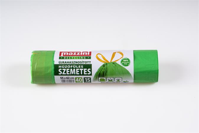 Szemeteszsák, újrahasznosított, húzófüles, 40 l, 15 db, 55×62 cm, 16 µ, MAZZINI, zöld